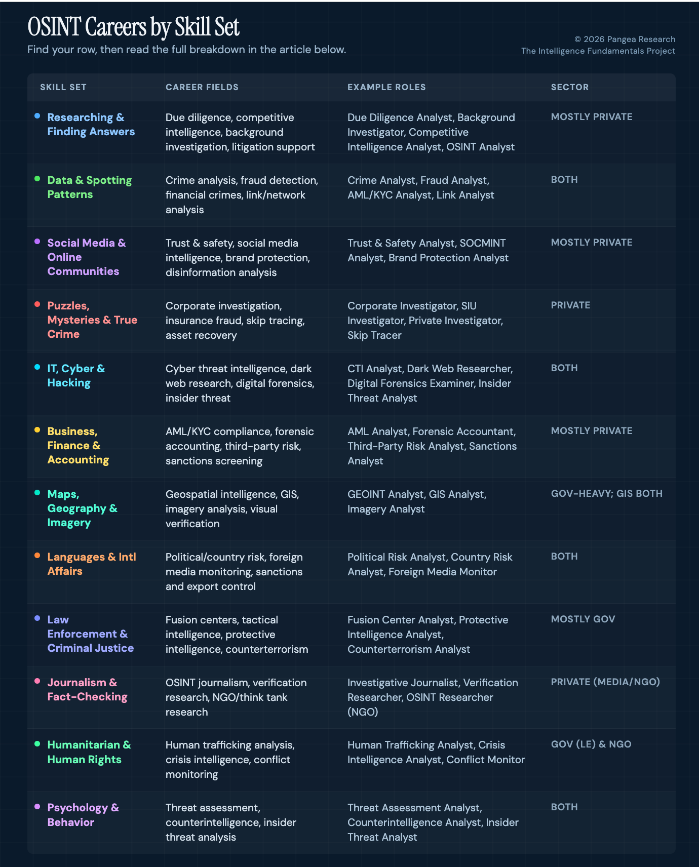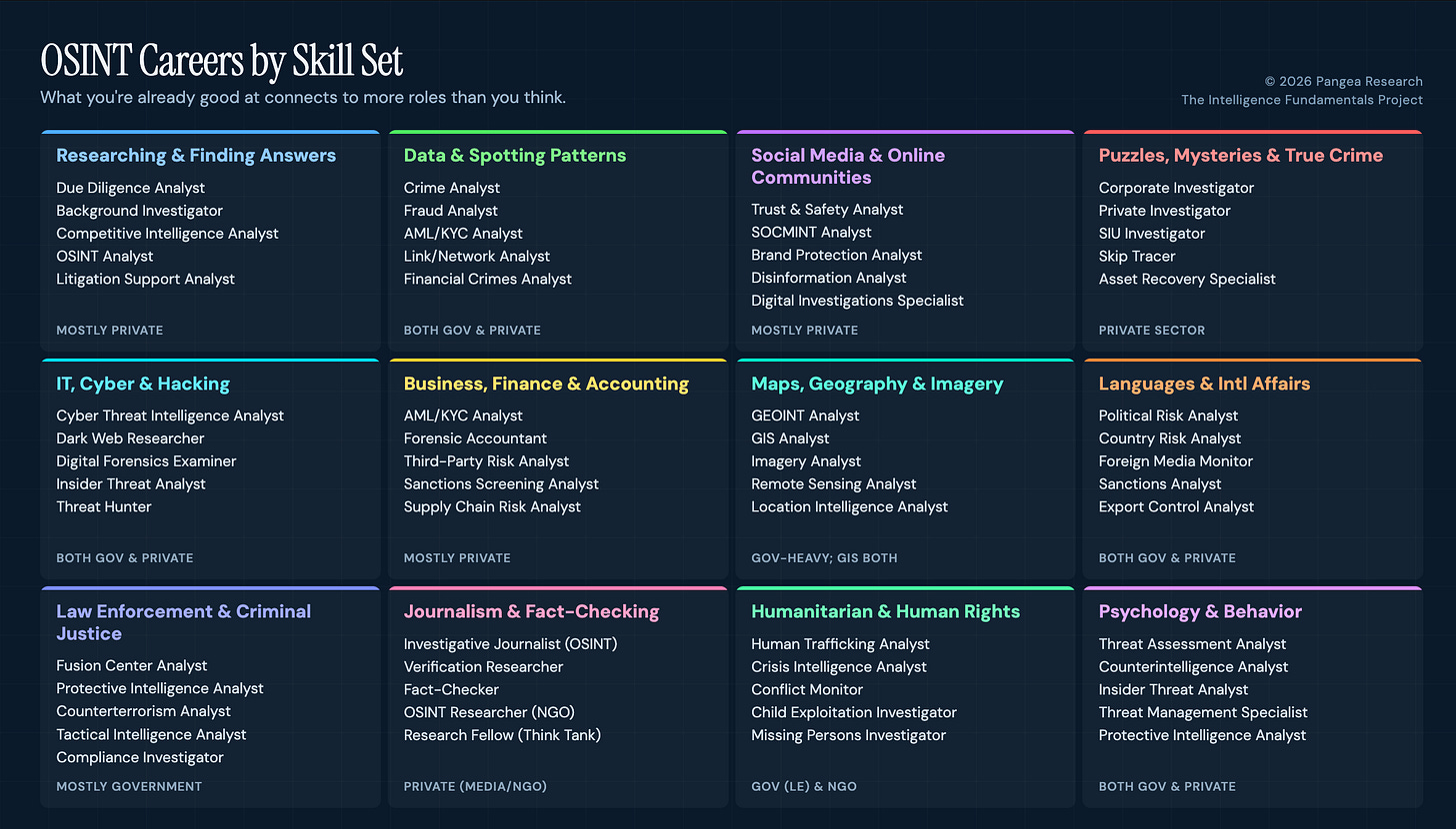 This map also focuses on fields where OSINT skills are central to the work. Plenty of other positions use OSINT as one tool among many (military intelligence officers, diplomats, policymakers, corporate executives who consume intelligence products), but those roles aren’t built around OSINT as a primary skill set. The fields listed here are the ones where your ability to find, evaluate, and make sense of open-source information is the core of what you’re being paid to do.
