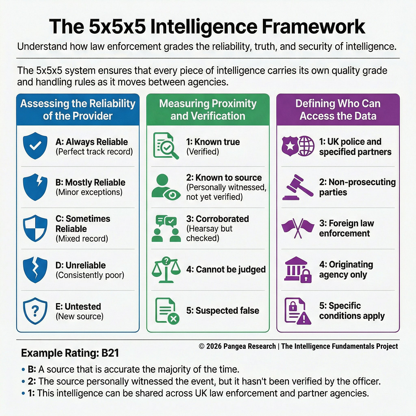 UK law enforcement grades intelligence using a framework called the 5x5x5, which evaluates three things at once: the source that provided the information, the information itself, and the rules governing who can see it and what they can do with it. That third dimension (the handling code) is what makes the 5x5x5 distinctive. In police work, the same report from an informant might be suitable for open sharing with a partner agency, restricted to a named investigation team, usable only after removing details that would identify the source, or so sensitive that it requires specific storage conditions and access controls.