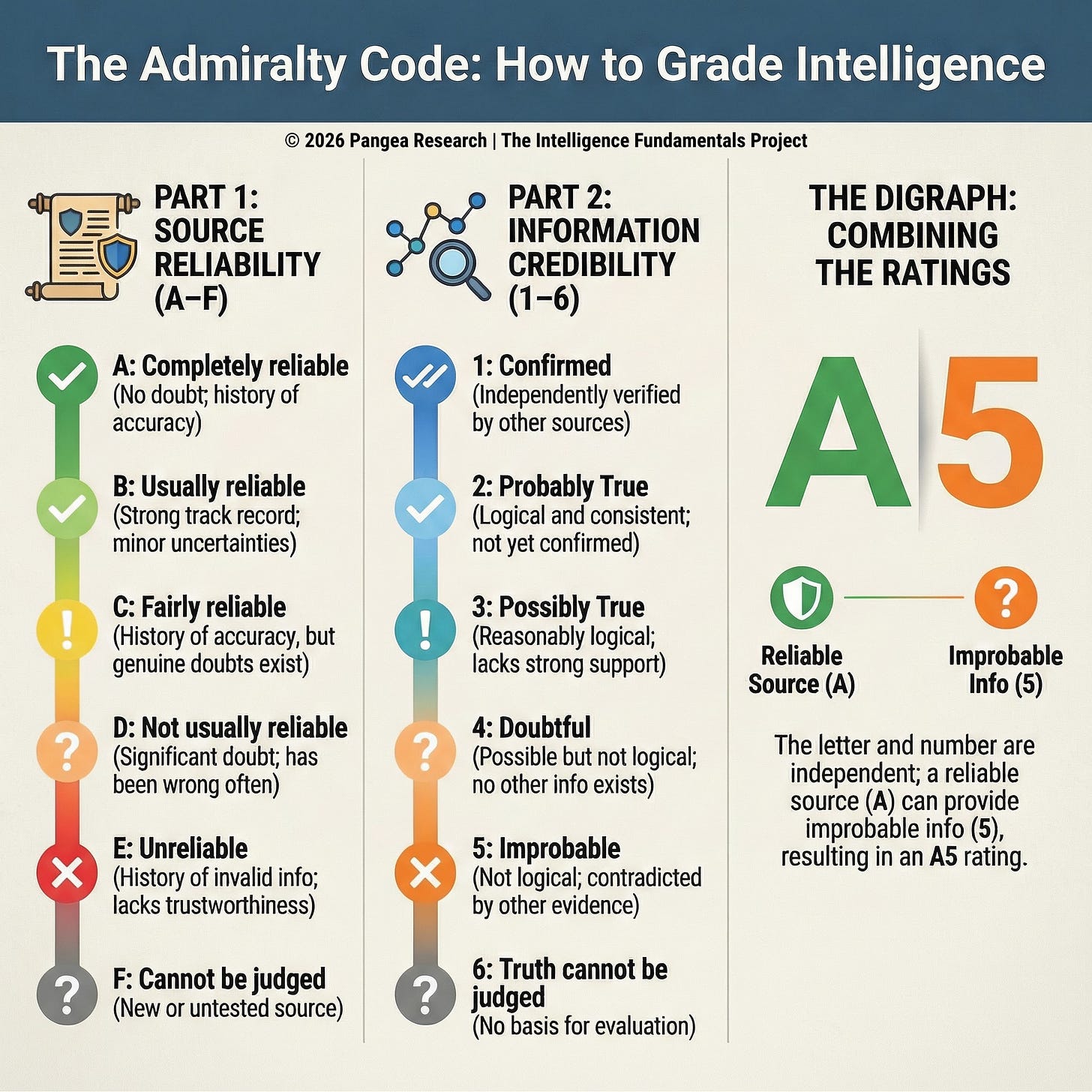 When a report arrives tagged B2, an analyst knows three things before reading a word: the source has a strong track record, the information is logically consistent with other reporting, and no one has independently confirmed it yet. That entire evaluation fits in two characters. The Admiralty Code (formally the NATO Intelligence Grading System, codified in AJP-2.1 under STANAG 2511) pairs a letter rating for the source's reliability with a number rating for the information's credibility. The letter reflects the source's history; the number reflects this specific report. B2, C4, F1, A5: each combination tells the reader something different about how far they can lean on what they're about to read. The system traces back to 1939, when the British Director of Naval Intelligence needed a way to evaluate the flood of reports arriving from ships, agents, and allied services without attaching lengthy narrative caveats to each one (McLachlan 1968). NATO adopted and standardized the framework, and it remains the most widely used source evaluation shorthand in Western intelligence, military operations, law enforcement fusion centers, and (increasingly) corporate intelligence shops.